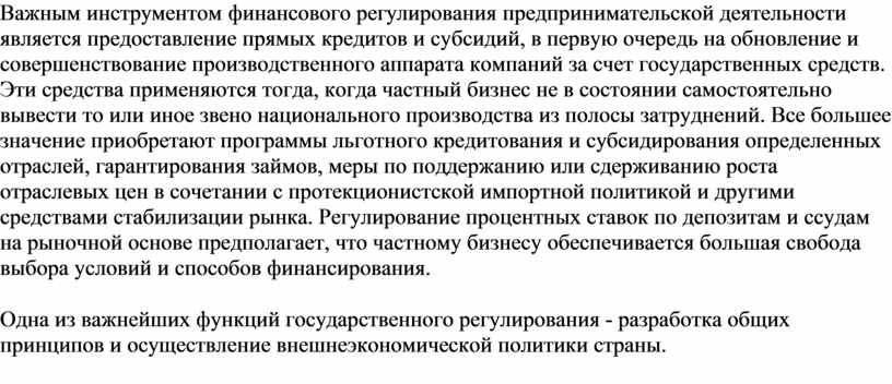 Важным инструментом финансового регулирования предпринимательской деятельности является предоставление прямых кредитов и субсидий, в первую очередь на обновление и совершенствование производственного аппарата компаний за счет государственных средств. Эти средства применяются тогда, когда частный бизнес не в состоянии самостоятельно вывести то или иное звено национального производства из полосы затруднений. Все большее значение приобретают программы льготного кредитования и субсидирования определенных отраслей, гарантирования займов, меры по поддержанию или сдерживанию роста отраслевых цен в сочетании с протекционистской импортной политикой и другими средствами стабилизации рынка. Регулирование процентных ставок по депозитам и ссудам на рыночной основе предполагает, что частному бизнесу обеспечивается большая свобода выбора условий и способов финансирования.