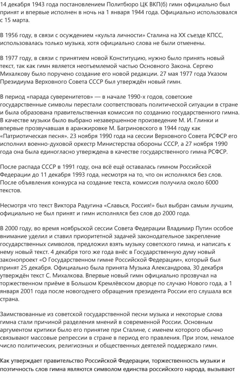 Музыка предыдущего гимна Союза Советских Социалистических Республик оставлена без изменений, в конкурсе текстов победило стихотворение Сергея Михалкова.