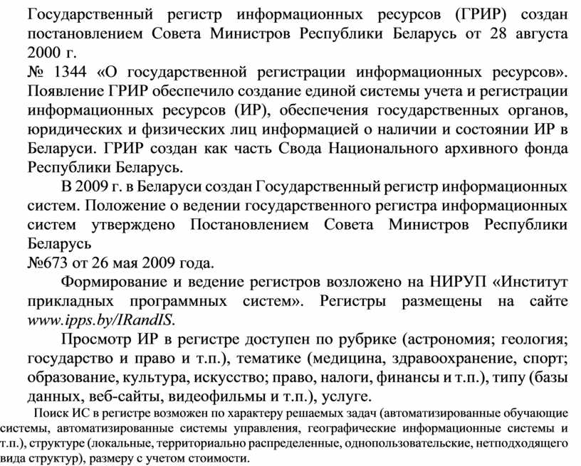 № 1344 «О государственной регистрации информационных ресурсов». Появление ГРИР обеспечило создание единой системы учета и регистрации информационных ресурсов (ИР), обеспечения государственных органов, юридических и физических лиц информацией о наличии и состоянии ИР в Беларуси. ГРИР создан как часть Свода Национального архивного фонда Республики Беларусь.