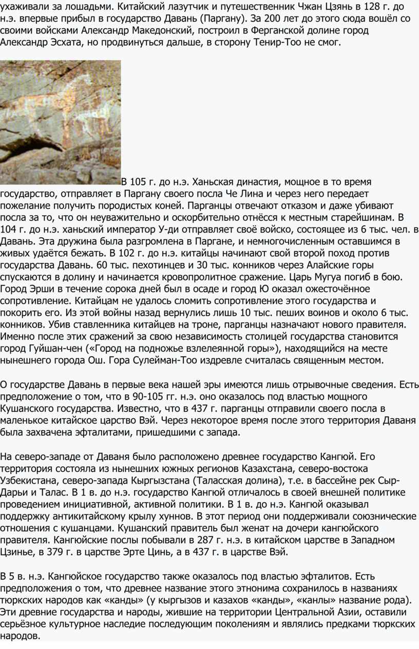 Учёные склонны предполагать, что в Паргане проживало не менее полумиллиона человек. Они поклонялись природным явлениям, солнцу, огню. С особой любовью ухаживали за лошадьми. Китайский лазутчик и путешественник Чжан Цзянь в 128 г. до н.э. впервые прибыл в государство Давань (Паргану). За 200 лет до этого сюда вошёл со своими войсками Александр Македонский, построил в Ферганской долине город Александр Эсхата, но продвинуться дальше, в сторону Тенир-Тоо не смог.