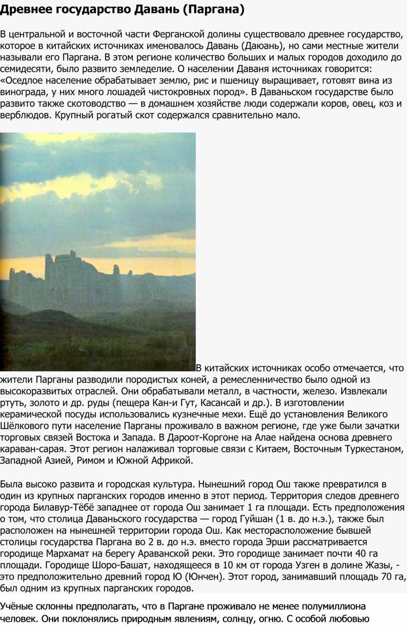 В центральной и восточной части Ферганской долины существовало древнее государство, которое в китайских источниках именовалось Давань (Даюань), но сами местные жители называли его Паргана. В этом регионе количество больших и малых городов доходило до семидесяти, было развито земледелие. О населении Даваня источниках говорится: «Оседлое население обрабатывает землю, рис и пшеницу выращивает, готовят вина из винограда, у них много лошадей чистокровных пород». В Даваньском государстве было развито также скотоводство — в домашнем хозяйстве люди содержали коров, овец, коз и верблюдов. Крупный рогатый скот содержался сравнительно мало.