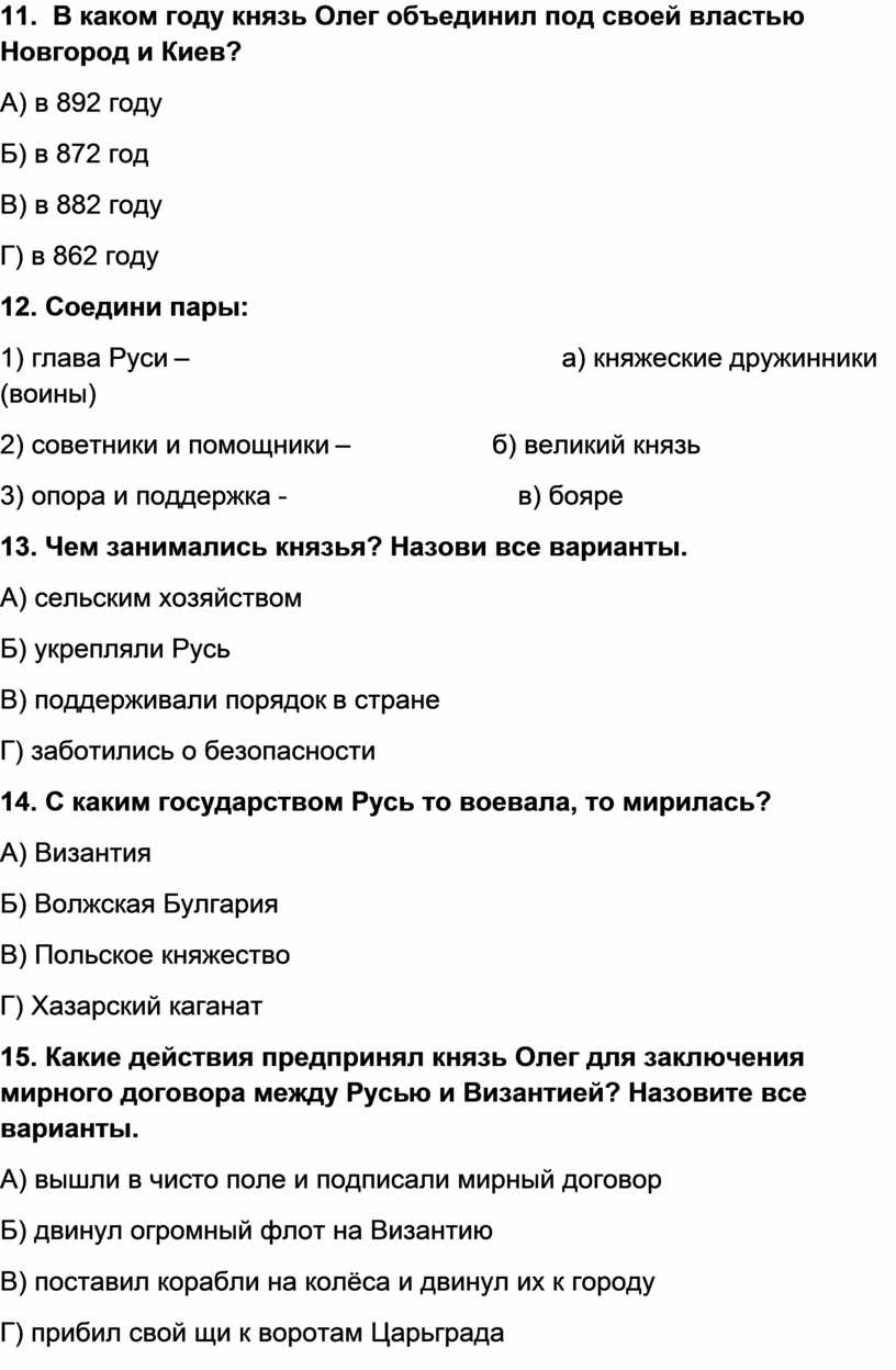 15. Какие действия предпринял князь Олег для заключения мирного договора между Русью и Византией? Назовите все варианты.