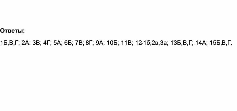 1Б,В,Г; 2А: 3В; 4Г; 5А; 6Б; 7В; 8Г; 9А; 10Б; 11В; 12-1б,2в,3а; 13Б,В,Г; 14А; 15Б,В,Г.