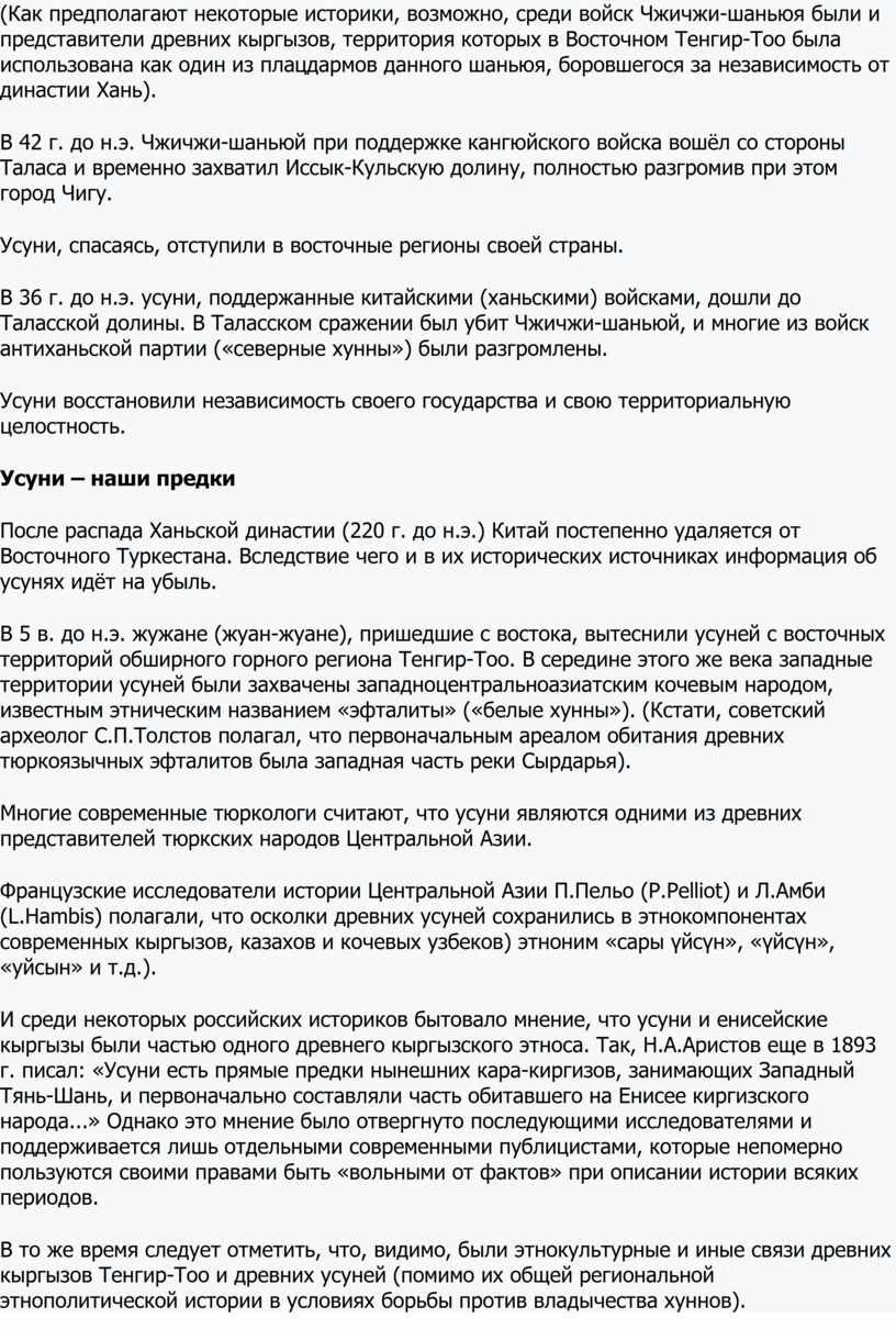 И среди некоторых российских историков бытовало мнение, что усуни и енисейские кыргызы были частью одного древнего кыргызского этноса. Так, Н.А.Аристов еще в 1893 г. писал: «Усуни есть прямые предки нынешних кара-киргизов, занимающих Западный Тянь-Шань, и первоначально составляли часть обитавшего на Енисее киргизского народа...» Однако это мнение было отвергнуто последующими исследователями и поддерживается лишь отдельными современными публицистами, которые непомерно пользуются своими правами быть «вольными от фактов» при описании истории всяких периодов.