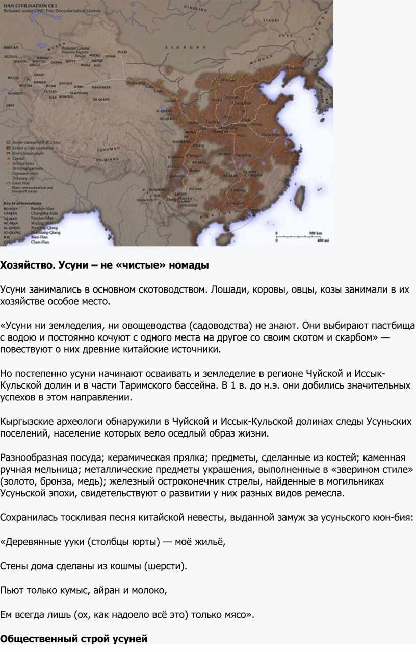 Но постепенно усуни начинают осваивать и земледелие в регионе Чуйской и Иссык-Кульской долин и в части Таримского бассейна. В 1 в. до н.э. они добились значительных успехов в этом направлении.