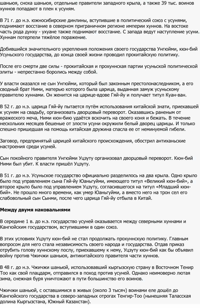 В середине 1 в. до н.э. государство усуней оказывается между северными хуннами и Кангюйским государством, вступившими в один союз.