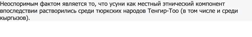 Неоспоримым фактом является то, что усуни как местный этнический компонент впоследствии растворились среди тюркских народов Тенгир-Тоо (в том числе и среди кыргызов).