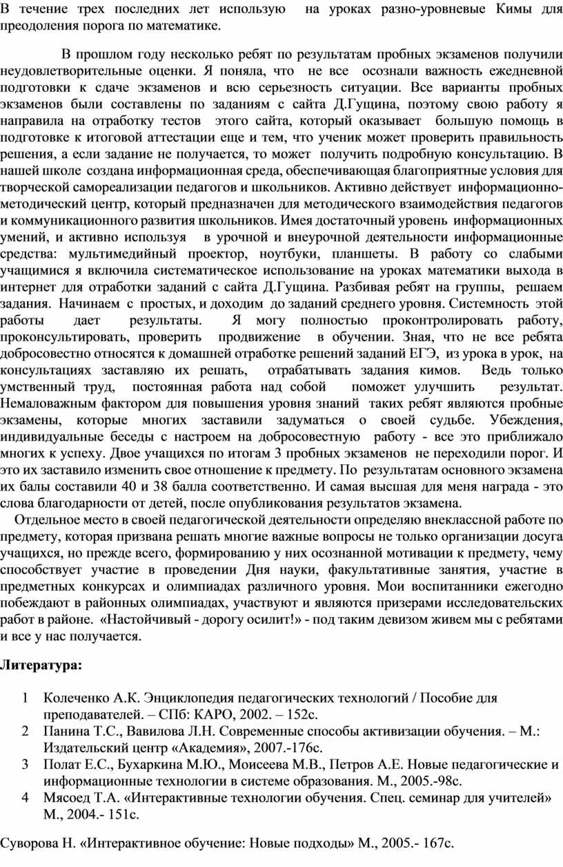В прошлом году несколько ребят по результатам пробных экзаменов получили неудовлетворительные оценки. Я поняла, что не все осознали важность ежедневной подготовки к сдаче экзаменов и всю серьезность ситуации. Все варианты пробных экзаменов были составлены по заданиям с сайта Д.Гущина, поэтому свою работу я направила на отработку тестов этого сайта, который оказывает большую помощь в подготовке к итоговой аттестации еще и тем, что ученик может проверить правильность решения, а если задание не получается, то может получить подробную консультацию. В нашей школе создана информационная среда, обеспечивающая благоприятные условия для творческой самореализации педагогов и школьников. Активно действует информационно-методический центр, который предназначен для методического взаимодействия педагогов и коммуникационного развития школьников. Имея достаточный уровень информационных умений, и активно используя в урочной и внеурочной деятельности информационные средства: мультимедийный проектор, ноутбуки, планшеты. В работу со слабыми учащимися я включила систематическое использование на уроках математики выхода в интернет для отработки заданий с сайта Д.Гущина. Разбивая ребят на группы, решаем задания. Начинаем с простых, и доходим до заданий среднего уровня. Системность этой работы дает результаты. Я могу полностью проконтролировать работу, проконсультировать, проверить продвижение в обучении. Зная, что не все ребята добросовестно относятся к домашней отработке решений заданий ЕГЭ, из урока в урок, на консультациях заставляю их решать, отрабатывать задания кимов. Ведь только умственный труд, постоянная работа над собой поможет улучшить результат. Немаловажным фактором для повышения уровня знаний таких ребят являются пробные экзамены, которые многих заставили задуматься о своей судьбе. Убеждения, индивидуальные беседы с настроем на добросовестную работу - все это приближало многих к успеху. Двое учащихся по итогам 3 пробных экзаменов не переходили порог. И это их заставило изменить свое отношение к предмету. По результатам основного экзамена их балы составили 40 и 38 балла соответственно. И самая высшая для меня награда - это слова благодарности от детей, после опубликования результатов экзамена.