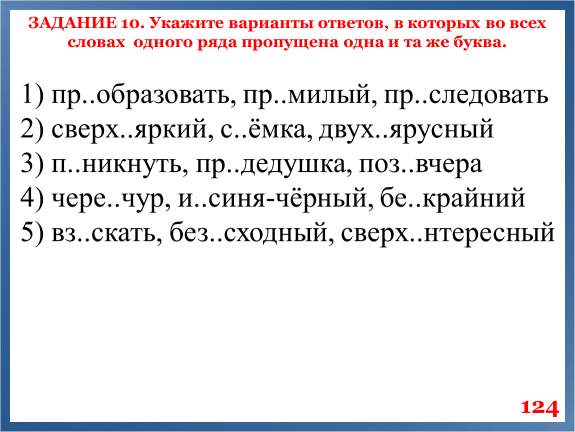 ЗАДАНИЕ 10. Укажите варианты ответов, в которых во всех словах одного ряда пропущена одна и та же буква.