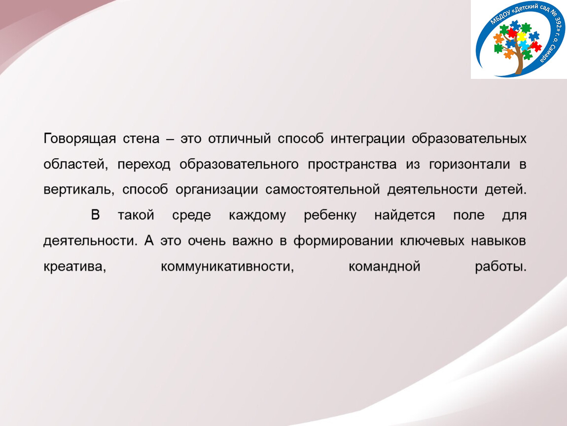 Говорящая стена – это отличный способ интеграции образовательных областей, переход образовательного пространства из горизонтали в вертикаль, способ организации самостоятельной деятельности детей. В такой среде каждому ребенку найдется поле для деятельности. А это очень важно в формировании ключевых навыков креатива, коммуникативности, командной работы.