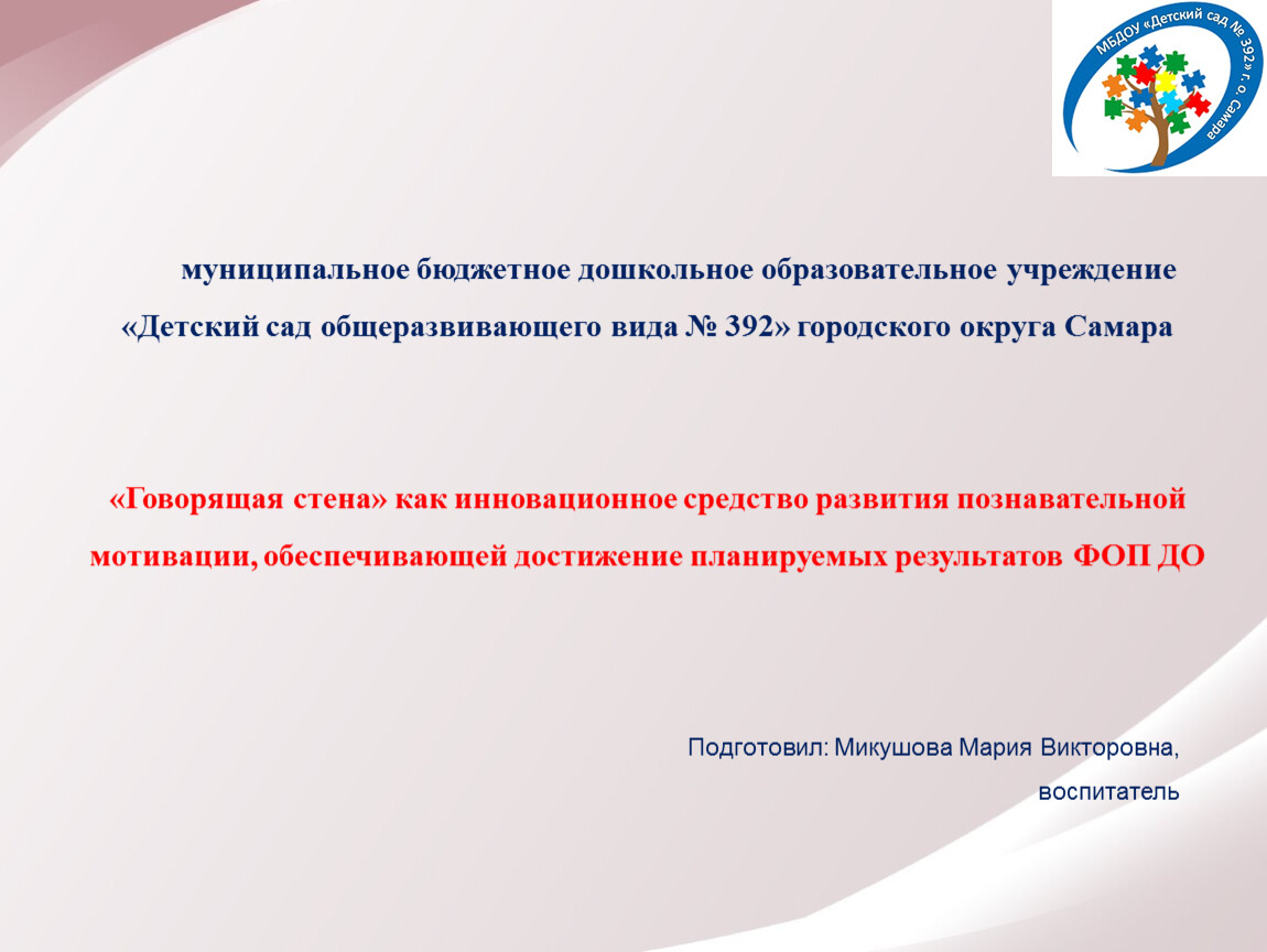 муниципальное бюджетное дошкольное образовательное учреждение «Детский сад общеразвивающего вида № 392» городского округа Самара«Говорящая стена» как инновационное средство развития познавательной мотивации, обеспечивающей достижение планируемых результатов ФОП ДО