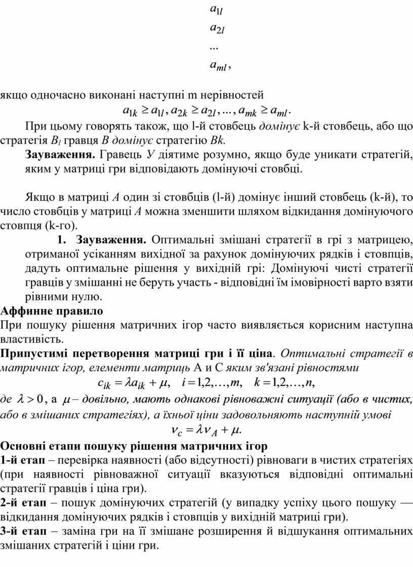 1. Зауваження. Оптимальні змішані стратегії в грі з матрицею, отриманої усіканням вихідної за рахунок домінуючих рядків і стовпців, дадуть оптимальне рішення у вихідній грі: Домінуючі чисті стратегії гравців у змішанні не беруть участь - відповідні їм імовірності варто взяти рівними нулю.