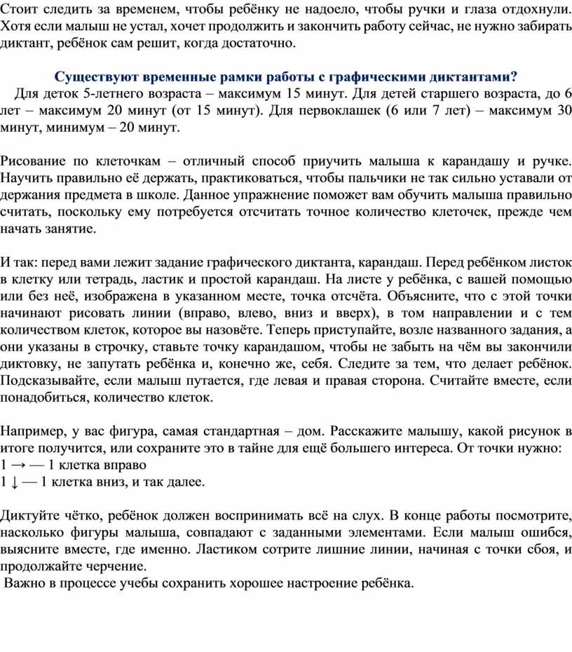 И так: перед вами лежит задание графического диктанта, карандаш. Перед ребёнком листок в клетку или тетрадь, ластик и простой карандаш. На листе у ребёнка, с вашей помощью или без неё, изображена в указанном месте, точка отсчёта. Объясните, что с этой точки начинают рисовать линии (вправо, влево, вниз и вверх), в том направлении и с тем количеством клеток, которое вы назовёте. Теперь приступайте, возле названного задания, а они указаны в строчку, ставьте точку карандашом, чтобы не забыть на чём вы закончили диктовку, не запутать ребёнка и, конечно же, себя. Следите за тем, что делает ребёнок. Подсказывайте, если малыш путается, где левая и правая сторона. Считайте вместе, если понадобиться, количество клеток.