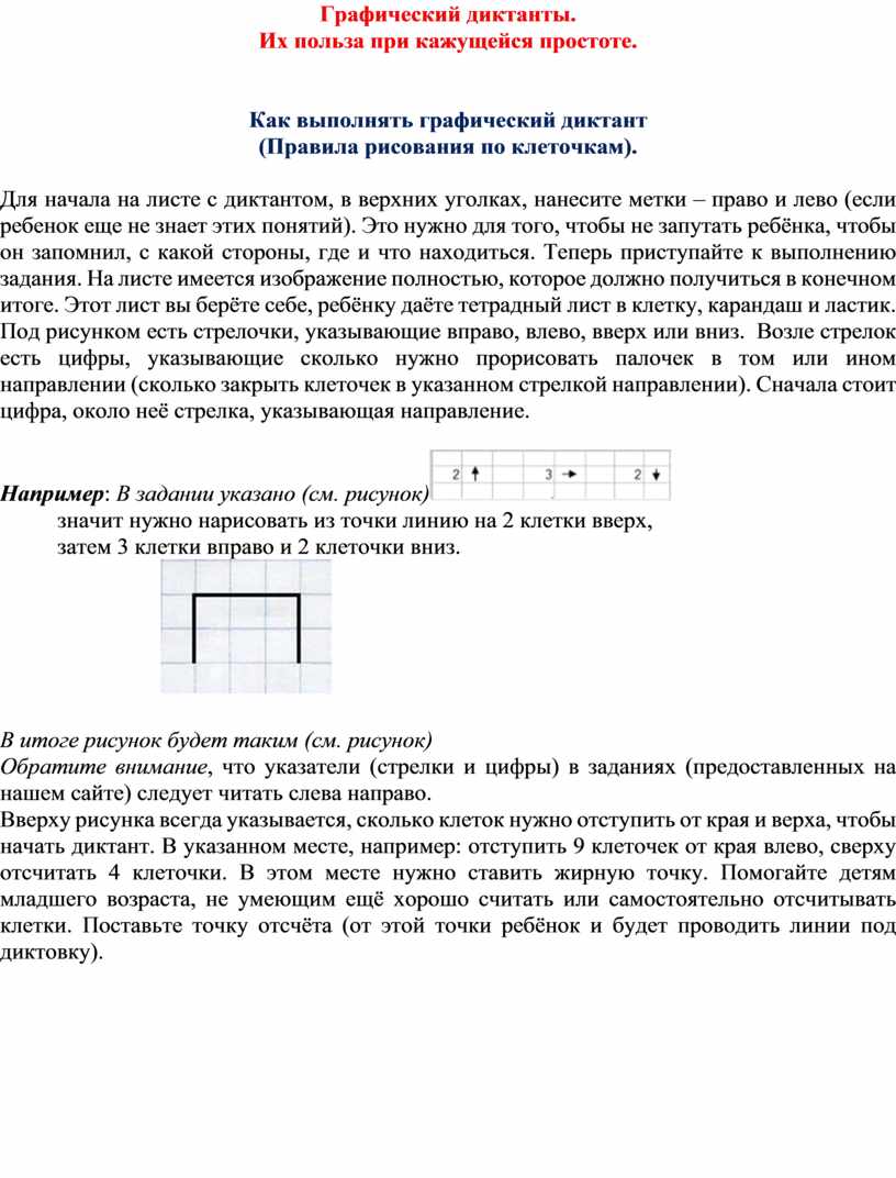 Представьте перед собой лист бумаги, на котором расчерчены клеточки. В задании указаны стрелочки (показывающие направление) и цифры (показывающее количество клеток, которые нужно пройти в указанном направлении). Если следовать указателям точно и внимательно, вести черту в нужном направлении на нужное расстояние, получается изображение – картинка. Иными словами: графические диктанты это рисование по клеточкам, пользуясь указателями в задании.