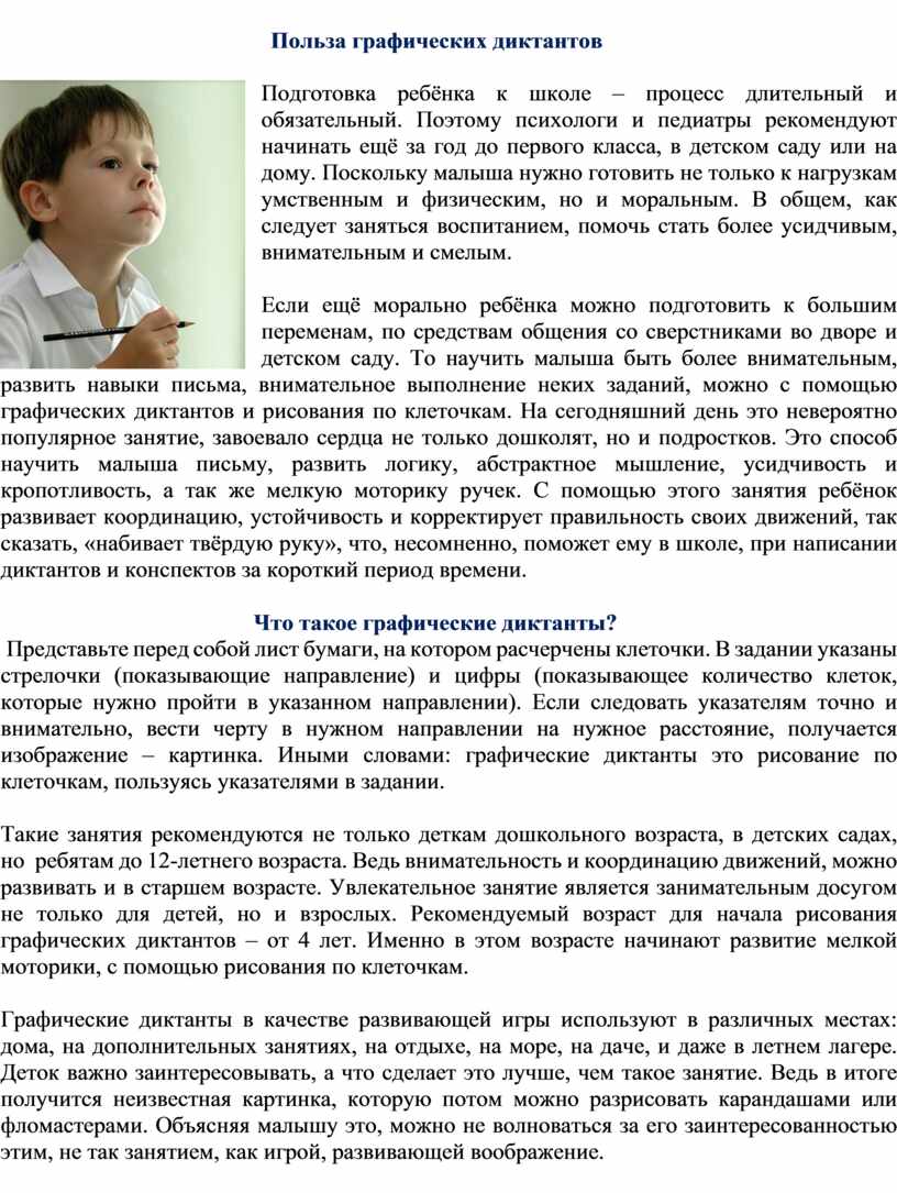 Если ещё морально ребёнка можно подготовить к большим переменам, по средствам общения со сверстниками во дворе и детском саду. То научить малыша быть более внимательным, развить навыки письма, внимательное выполнение неких заданий, можно с помощью графических диктантов и рисования по клеточкам. На сегодняшний день это невероятно популярное занятие, завоевало сердца не только дошколят, но и подростков. Это способ научить малыша письму, развить логику, абстрактное мышление, усидчивость и кропотливость, а так же мелкую моторику ручек. С помощью этого занятия ребёнок развивает координацию, устойчивость и корректирует правильность своих движений, так сказать, «набивает твёрдую руку», что, несомненно, поможет ему в школе, при написании диктантов и конспектов за короткий период времени.