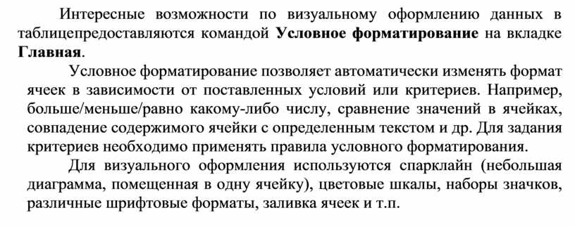 Интересные возможности по визуальному оформлению данных в таблице предоставляются командой Условное форматирование на вкладке Главная.
