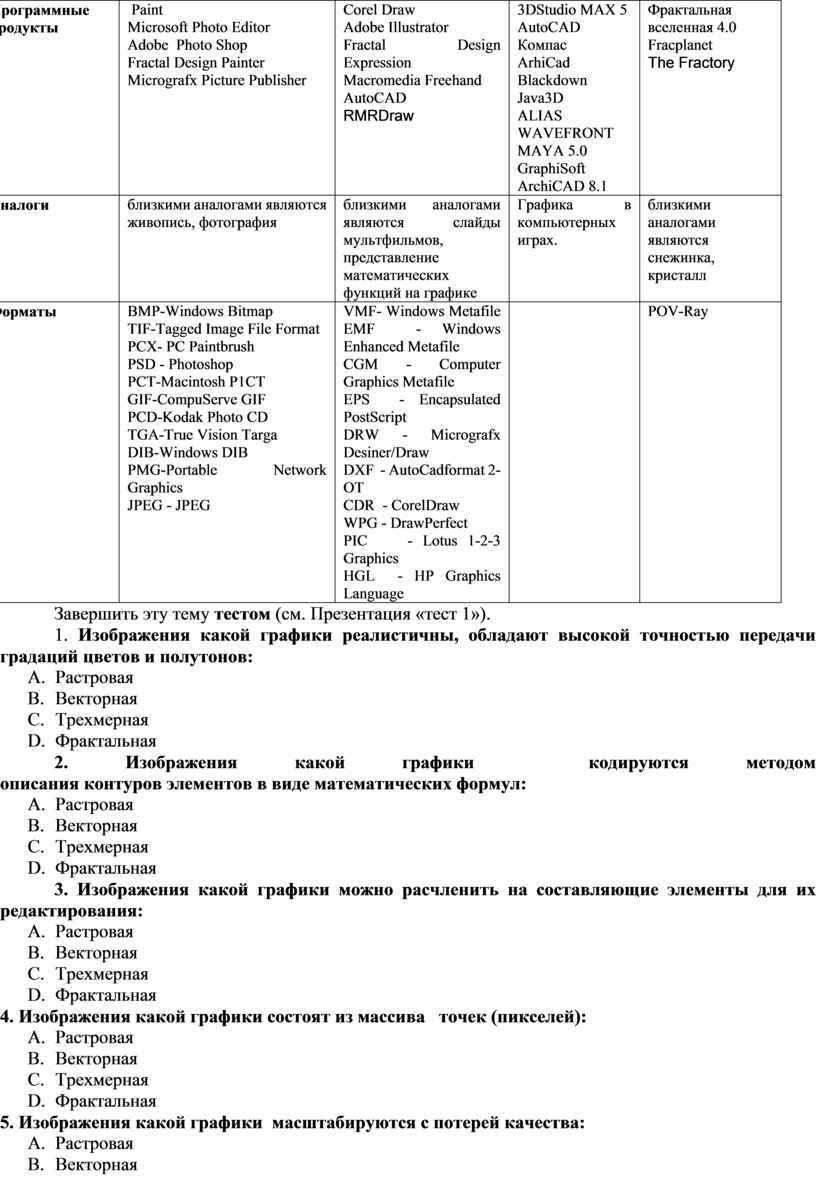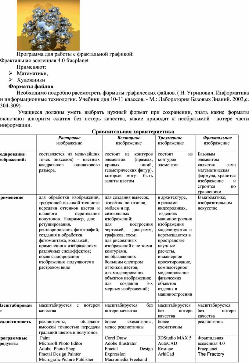 Необходимо подробно рассмотреть форматы графических файлов. ( Н. Угринович. Информатика и информационные технологии. Учебник для 10-11 классов. - М.: Лаборатория Базовых Знаний. 2003,с. 304-309)
