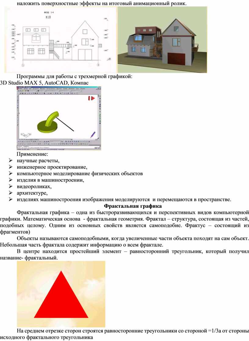 в архитектуре, в рекламе видеороликах, изделиях машиностроения изображения моделируются и перемещаются в пространстве научные расчеты, инженерное проектирование, компьютерное моделирование физических объектов изделия в машиностроении, |