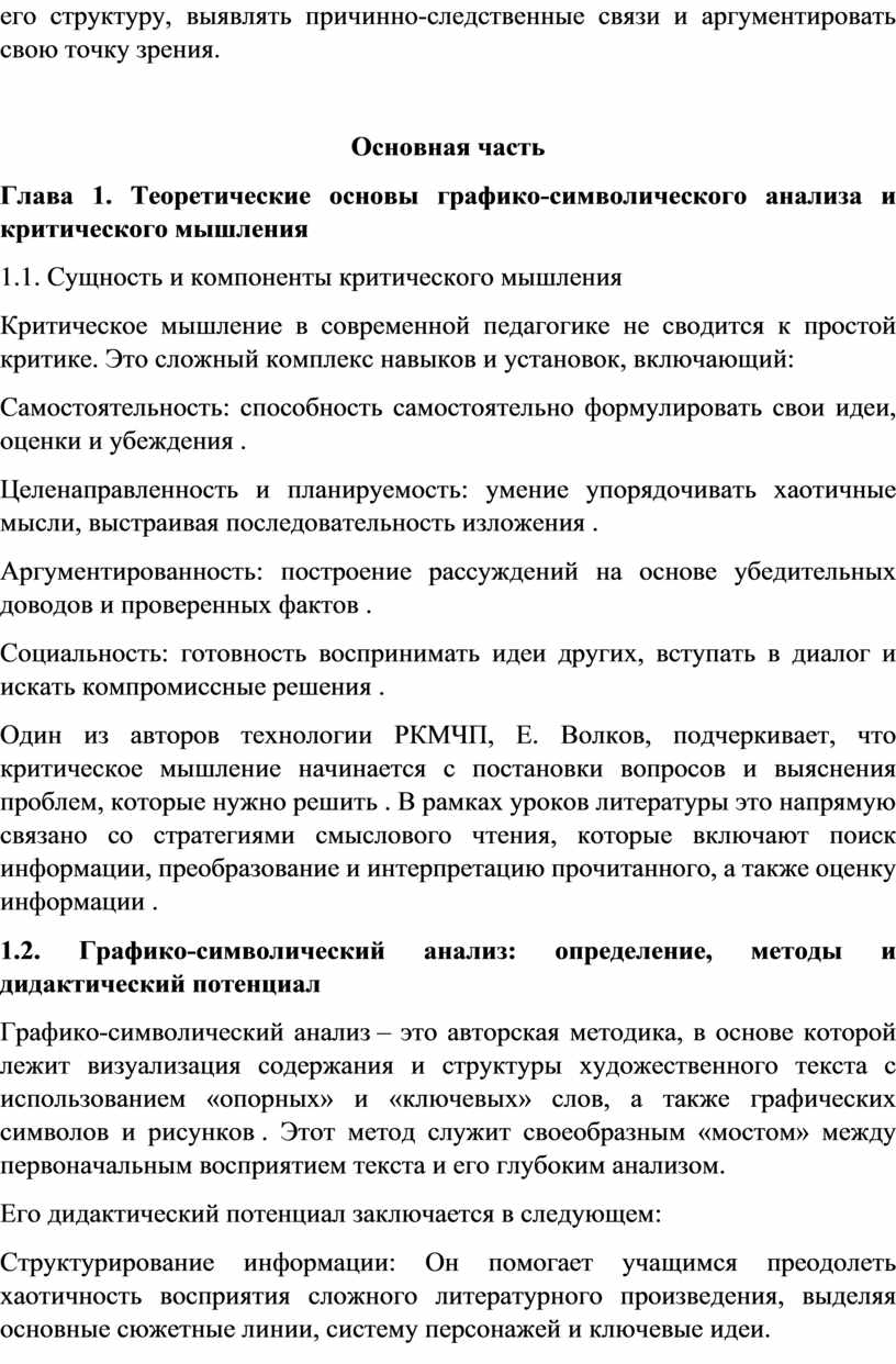 Цель работы: теоретически обосновать и практически продемонстрировать эффективность графико-символического анализа в развитии критического мышления учащихся на уроках литературы.