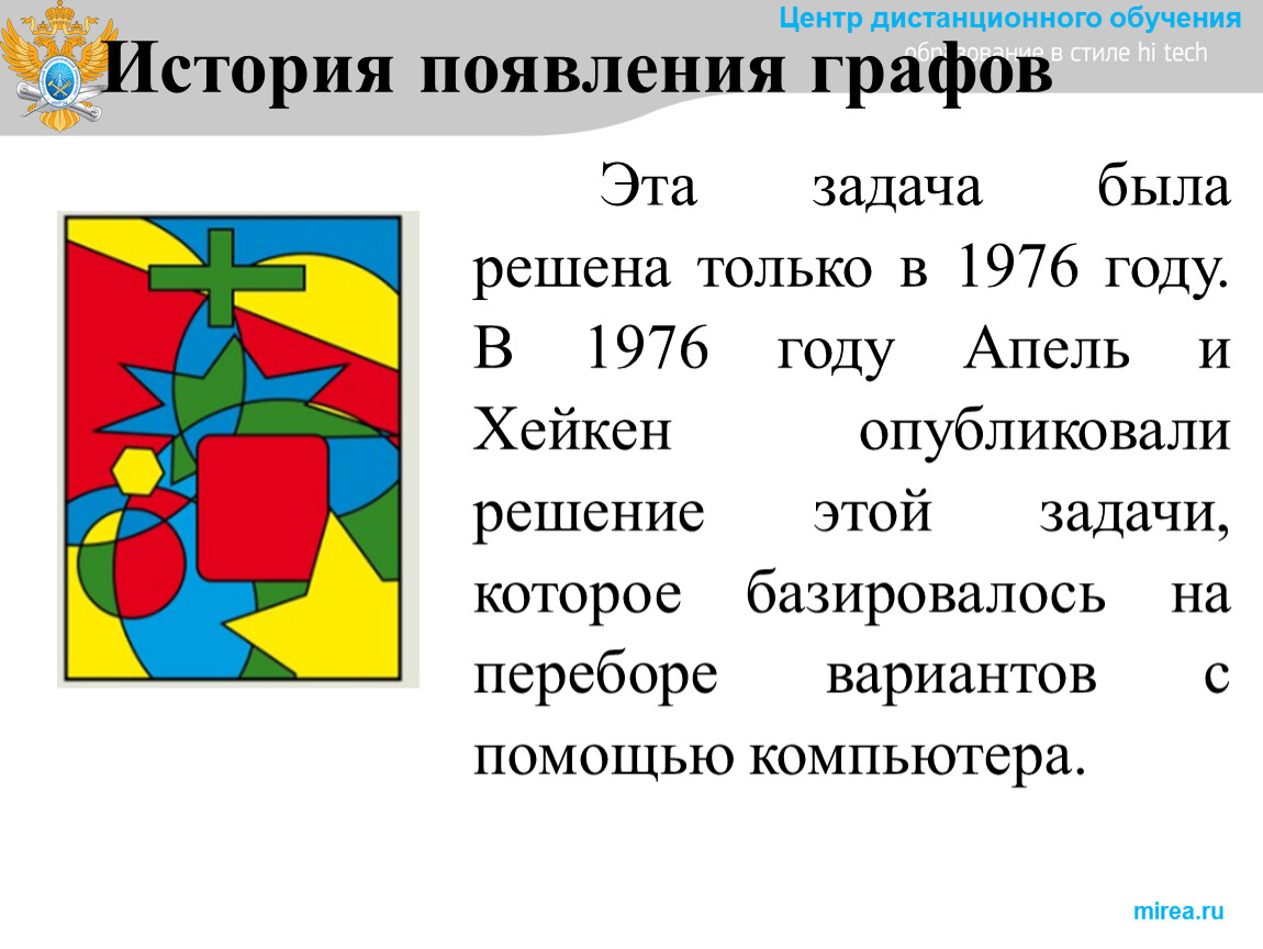 Эта задача была решена только в 1976 году. В 1976 году Апель и Хейкен опубликовали решение этой задачи, которое базировалось на переборе вариантов с помощью компьютера.