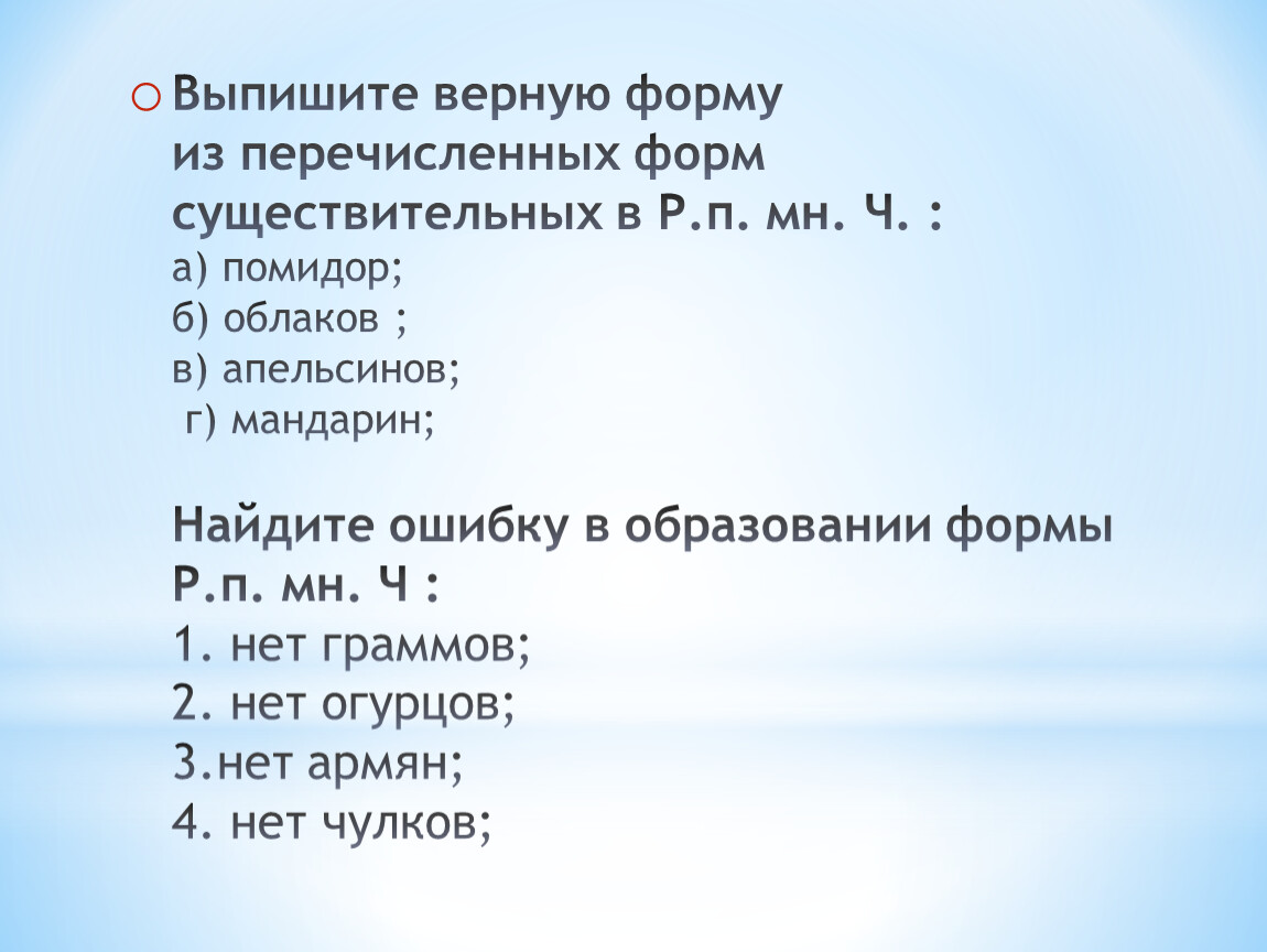 Выпишите верную формуиз перечисленных форм существительных в Р.п. мн. Ч. : а) помидор;б) облаков ;в) апельсинов; г) мандарин;Найдите ошибку в образовании формы Р.п. мн. Ч :1. нет граммов; 2. нет огурцов;3.нет армян;4. нет чулков;