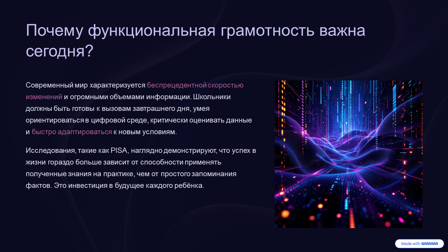 В современном мире, где информация окружает нас со всех сторон, крайне важно не просто обладать знаниями, но и уметь их эффективно применять. Эта презентация расскажет о том, что такое функциональная грамотность и почему она является фундаментом для успеха каждого ребёнка в XXI веке.