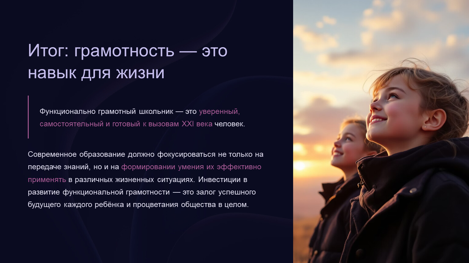 Современное образование должно фокусироваться не только на передаче знаний, но и на формировании умения их эффективно применять в различных жизненных ситуациях. Инвестиции в развитие функциональной грамотности — это залог успешного будущего каждого ребёнка и процветания общества в целом.