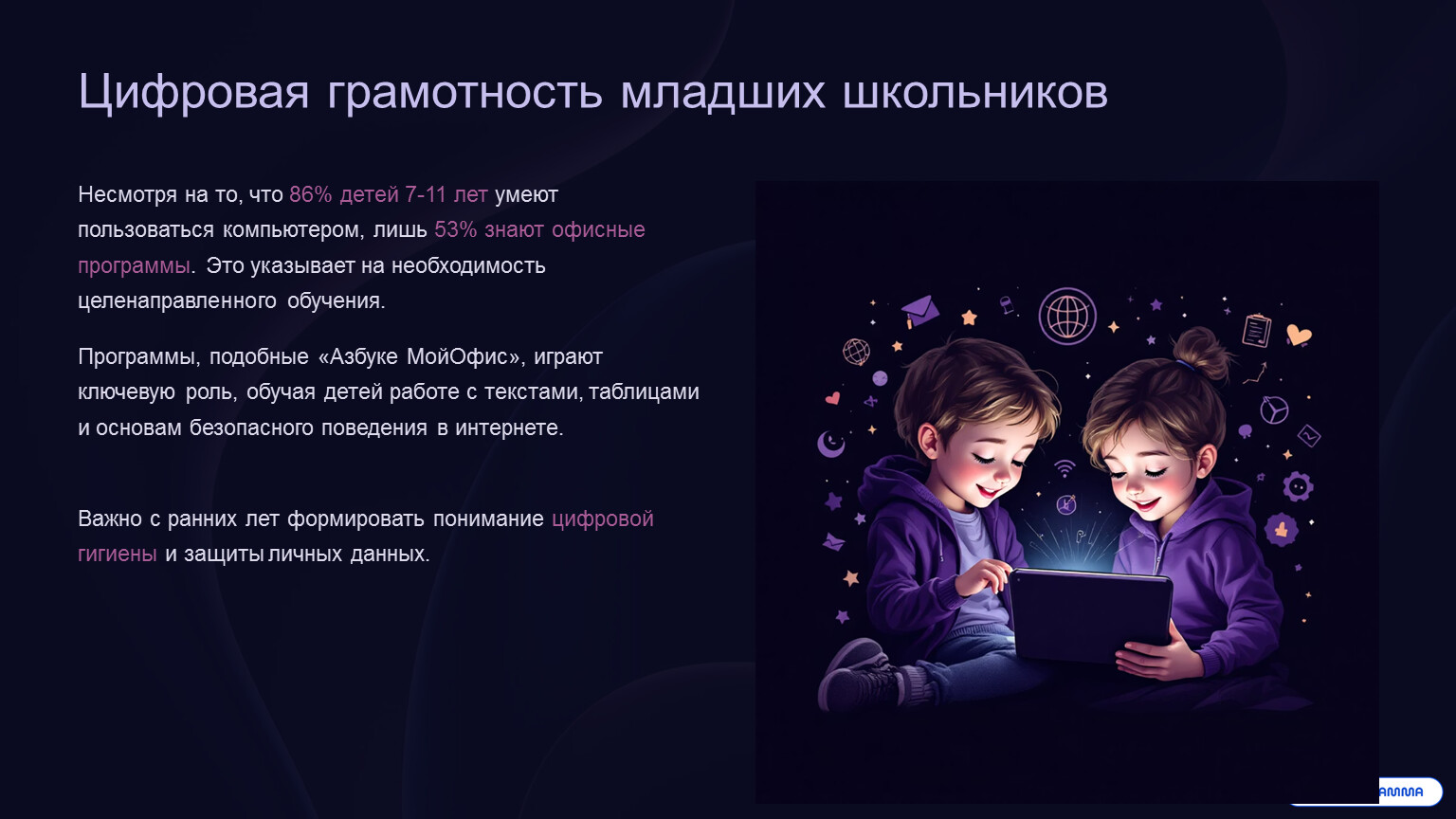 Программы, подобные «Азбуке МойОфис», играют ключевую роль, обучая детей работе с текстами, таблицами и основам безопасного поведения в интернете.