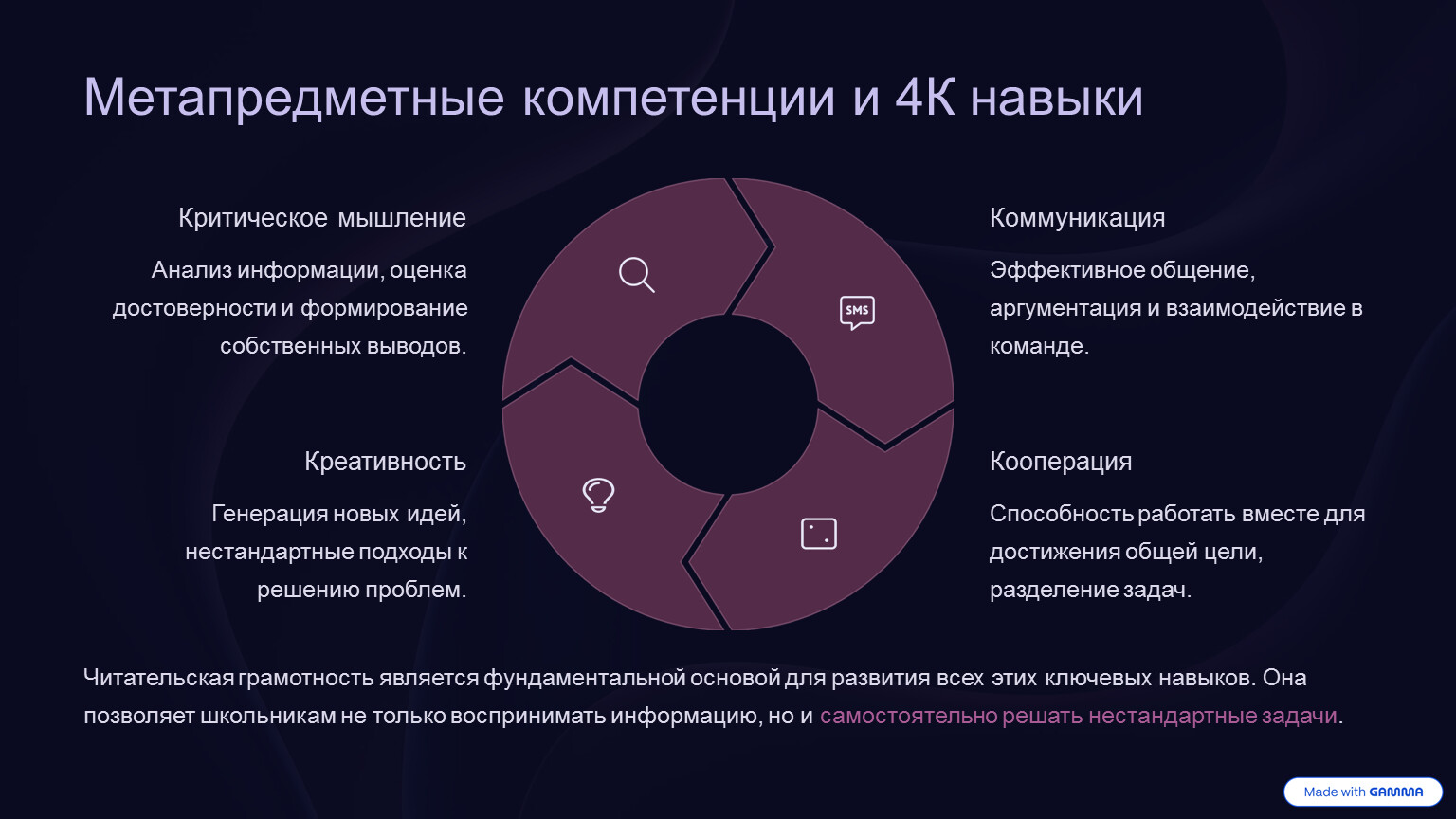 Читательская грамотность является фундаментальной основой для развития всех этих ключевых навыков. Она позволяет школьникам не только воспринимать информацию, но и самостоятельно решать нестандартные задачи.