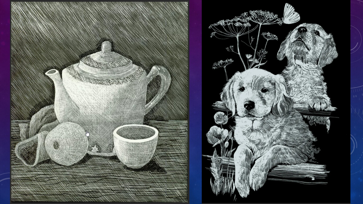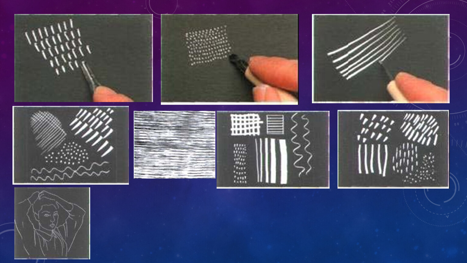 Не бойтесь использовать различные приемы: точки, штрихи, перекрестные штрихи и т.д. Также для внесения разнообразия в композицию используйте скребки различной толщины. Искусство техники граттажа ограничивается только вашей фантазией, поскольку строгих правил исполнения здесь не существует.
