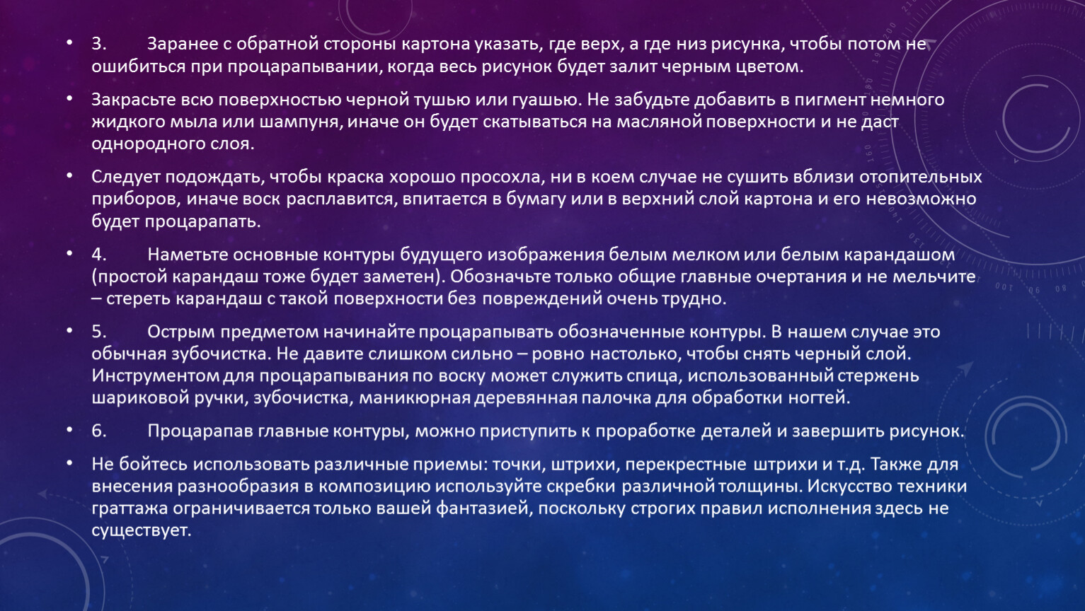 Следует подождать, чтобы краска хорошо просохла, ни в коем случае не сушить вблизи отопительных приборов, иначе воск расплавится, впитается в бумагу или в верхний слой картона и его невозможно будет процарапать.