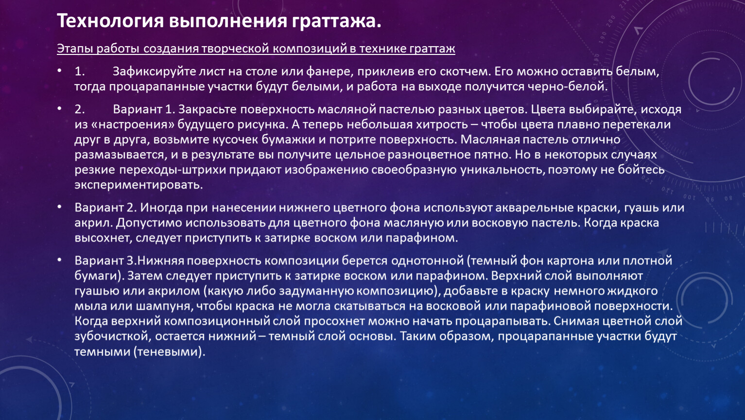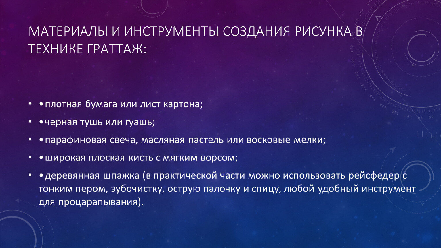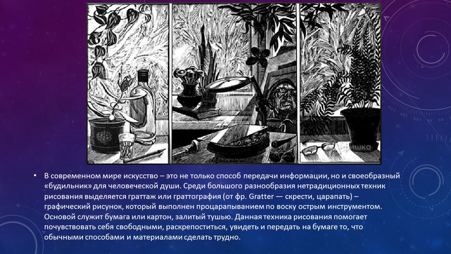 В современном мире искусство – это не только способ передачи информации, но и своеобразный «будильник» для человеческой души. Среди большого разнообразия нетрадиционных техник рисования выделяется граттаж или граттография (от фр. Gratter — скрести, царапать) – графический рисунок, который выполнен процарапыванием по воску острым инструментом. Основой служит бумага или картон, залитый тушью. Данная техника рисования помогает почувствовать себя свободными, раскрепоститься, увидеть и передать на бумаге то, что обычными способами и материалами сделать трудно.