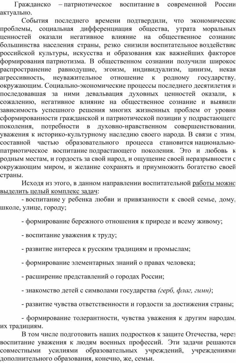 События последнего времени подтвердили, что экономические проблемы, социальная дифференциация общества, утрата моральных ценностей оказали негативное влияние на общественное сознание большинства населения страны, резко снизили воспитательное воздействие российской культуры, искусства и образования как важнейших факторов формирования патриотизма. В общественном сознании получили широкое распространение равнодушие, эгоизм, индивидуализм, цинизм, некая агрессивность, неуважительное отношение к родному государству, окружающим. Социально-экономические процессы последнего десятилетия и последовавшая за ними девальвация духовных ценностей оказали, к сожалению, негативное влияние на общественное сознание и выявили зависимость успешного решения многих жизненных проблем от уровня сформированности гражданской и патриотической позиции у подрастающего поколения, потребности в духовно-нравственном совершенствовании, уважения к историко-культурному наследию своего народа. В связи с этим, составной частью образовательного процесса становится национально-патриотическое воспитание подрастающего поколения. Это и любовь к родным местам, и гордость за свой народ, и ощущение своей неразрывности с окружающим миром, и желание сохранять и приумножить богатство своей страны.