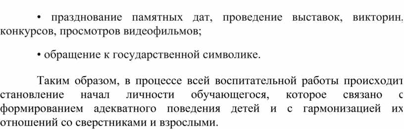 Таким образом, в процессе всей воспитательной работы происходит становление начал личности обучающегося, которое связано с формированием адекватного поведения детей и с гармонизацией их отношений со сверстниками и взрослыми.