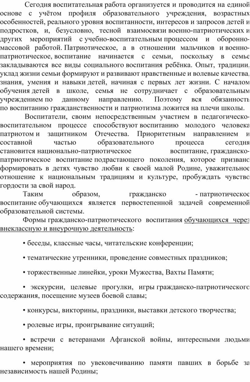 Сегодня воспитательная работа организуется и проводится на единой основе с учётом профиля образовательного учреждения, возрастных особенностей, реального уровня воспитанности, интересов и запросов детей и подростков, и, безусловно, тесной взаимосвязи военно-патриотических и других мероприятий с учебно-воспитательным процессом и оборонно-массовой работой. Патриотическое, а в отношении мальчиков и военно-патриотическое, воспитание начинается с семьи, поскольку в семье закладываются все виды социального воспитания ребёнка. Опыт, традиции, уклад жизни семьи формируют и развивают нравственные и волевые качества, знания, умения и навыки детей, начиная с первых лет жизни. С началом обучения детей в школе, семья не сотрудничает с образовательным учреждением по данному направлению. Поэтому вся обязанность по воспитанию гражданственности и патриотизма ложится на плечи школы.