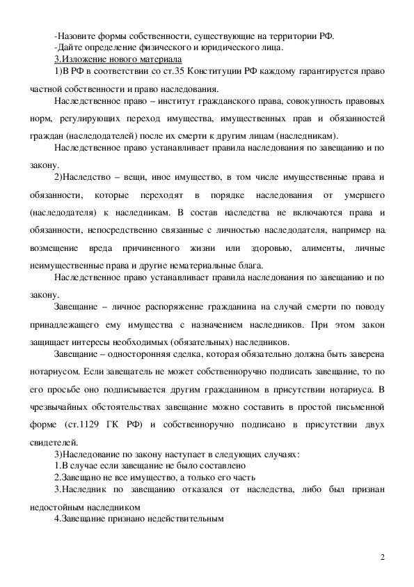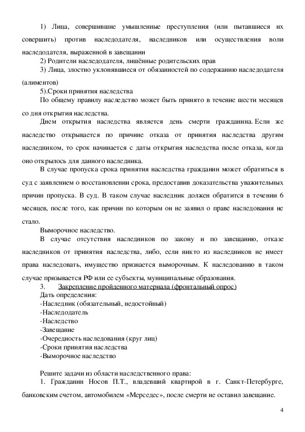 Учащийся должен знать: понятия наследодатель, наследник, наследство,