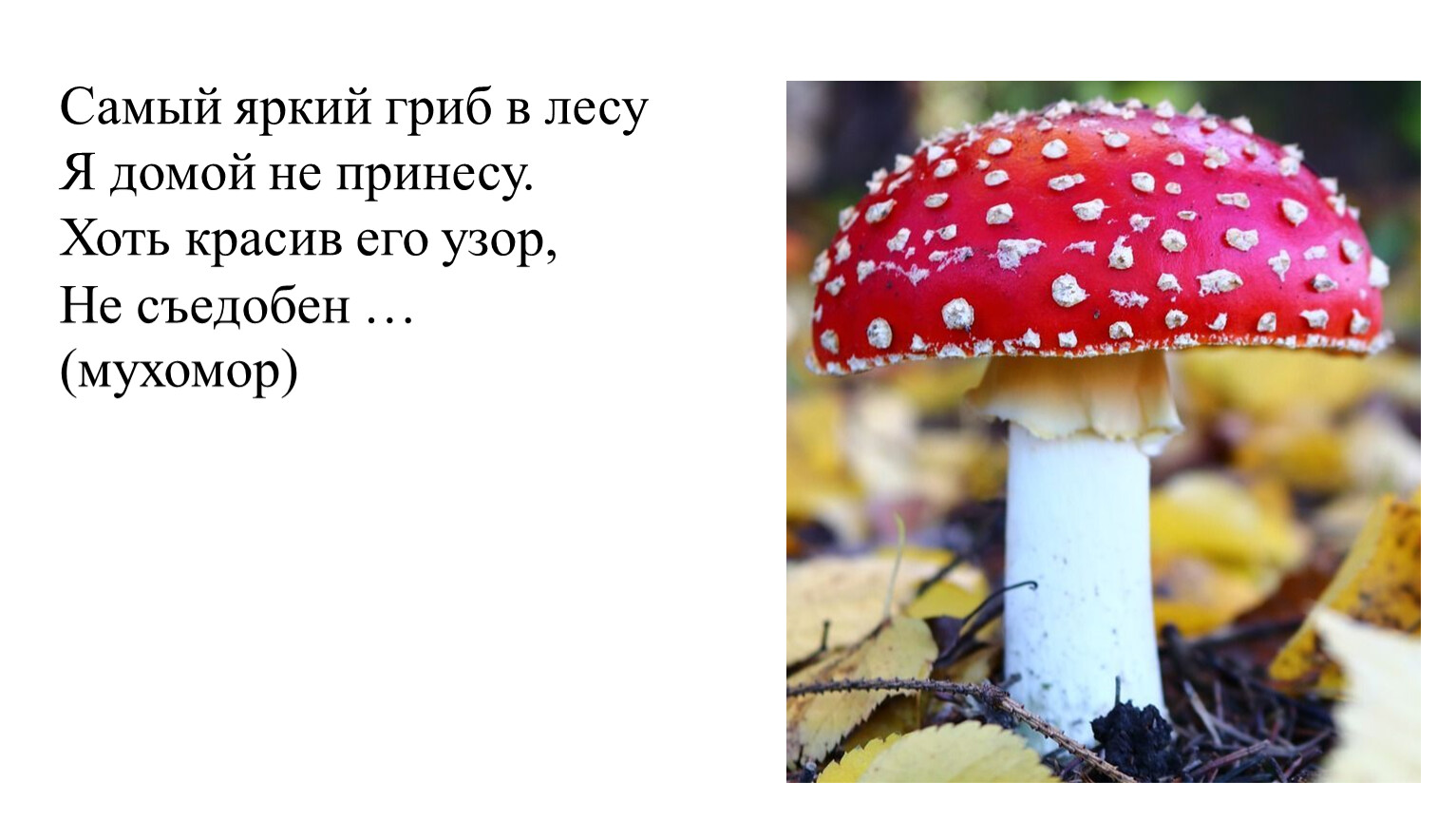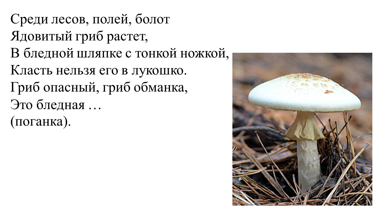 Среди лесов, полей, болотЯдовитый гриб растет,В бледной шляпке с тонкой ножкой,Класть нельзя его в лукошко.Гриб опасный, гриб обманка,Это бледная …