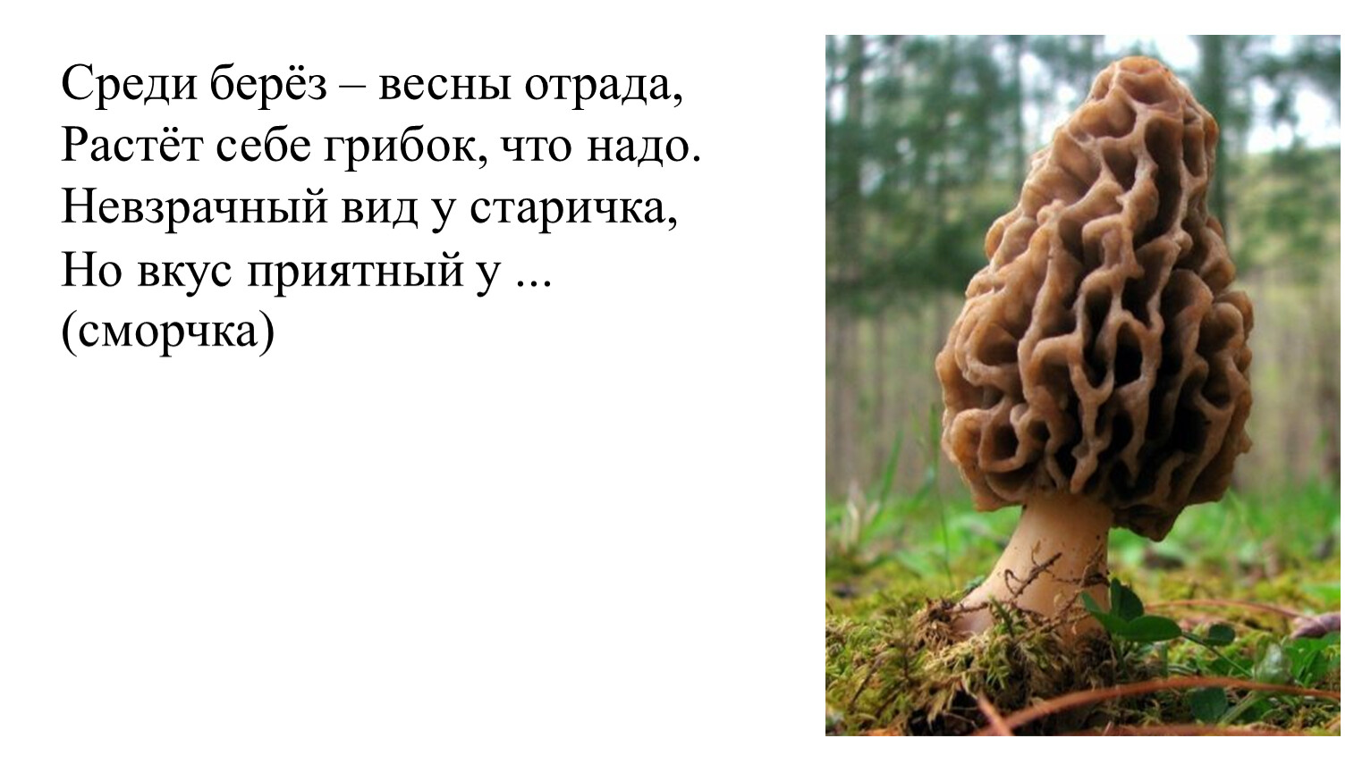 Среди берёз – весны отрада,Растёт себе грибок, что надо.Невзрачный вид у старичка,Но вкус приятный у ...