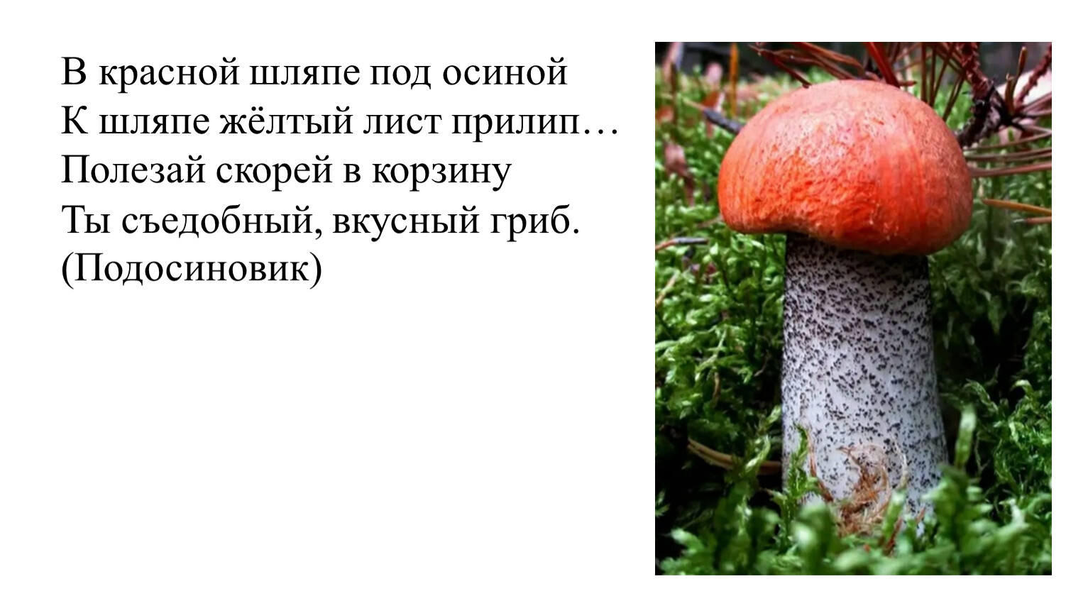 В красной шляпе под осинойК шляпе жёлтый лист прилип…Полезай скорей в корзинуТы съедобный, вкусный гриб.