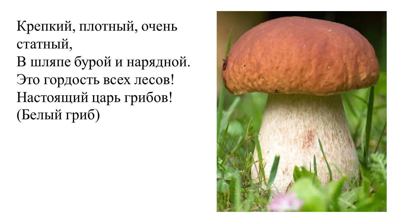 Крепкий, плотный, очень статный,В шляпе бурой и нарядной.Это гордость всех лесов!Настоящий царь грибов! (Белый гриб)