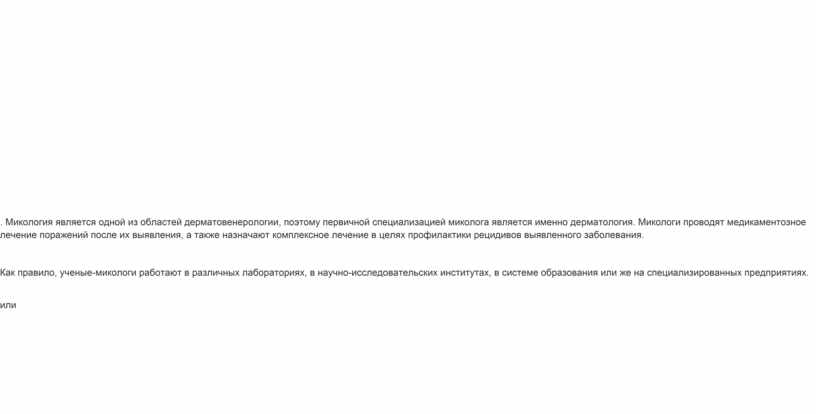 . Микология является одной из областей дерматовенерологии, поэтому первичной специализацией миколога является именно дерматология. Микологи проводят медикаментозное лечение поражений после их выявления, а также назначают комплексное лечение в целях профилактики рецидивов выявленного заболевания.
