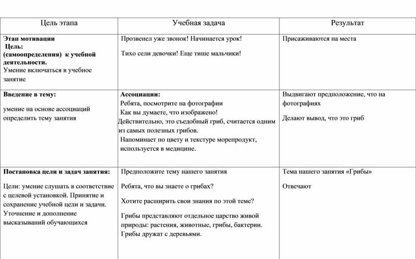 Личностные УУД: - формировать умение выказывать своё мнение, выражать свои эмоции; - формировать мотивации к обучению и целенаправленной познавательной деятельности; - знакомство с профессиями миколог, грибовод Регулятивные УУД: - определять и формулировать и удерживать учебную задачу; - умение высказывать своё предположение на основе имеющихся знаний о грибах; - выстраивать последовательность необходимых операций (алгоритм действий); Познавательные УУД: - называть части грибов - называть виды грибов; – рассказывать о плесневых грибах; – называть грибы-невидимки; – проводить опыт по выращиванию плесени; – называть грибы-паразиты; Коммуникативные УУД: - учиться работать в парах, приходить к общему решению в совместной деятельности; - слушать и понимать речь других. |