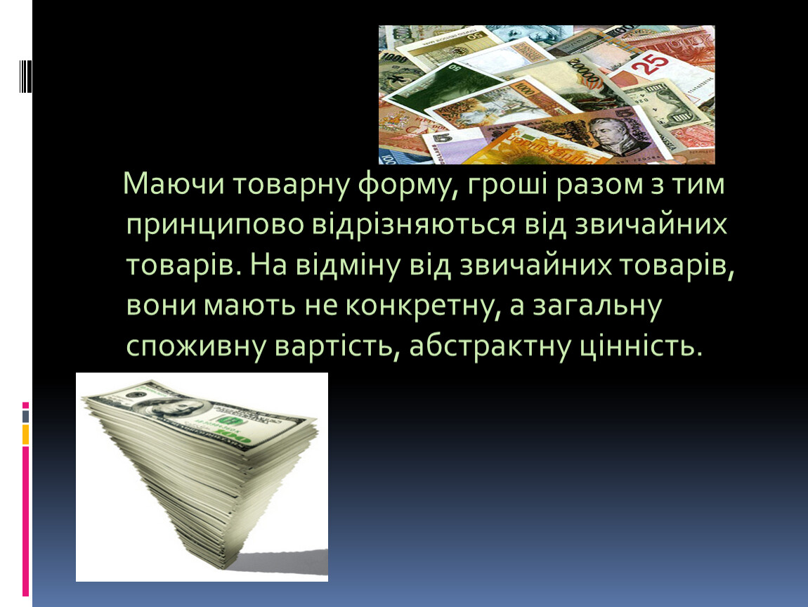 Маючи товарну форму, гроші разом з тим принципово відрізняються від звичайних товарів. На відміну від звичайних товарів, вони мають не конкретну, а загальну споживну вартість, абстрактну цінність.