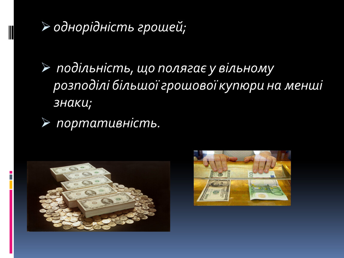 подільність, що полягає у вільному розподілі більшої грошової купюри на менші знаки;