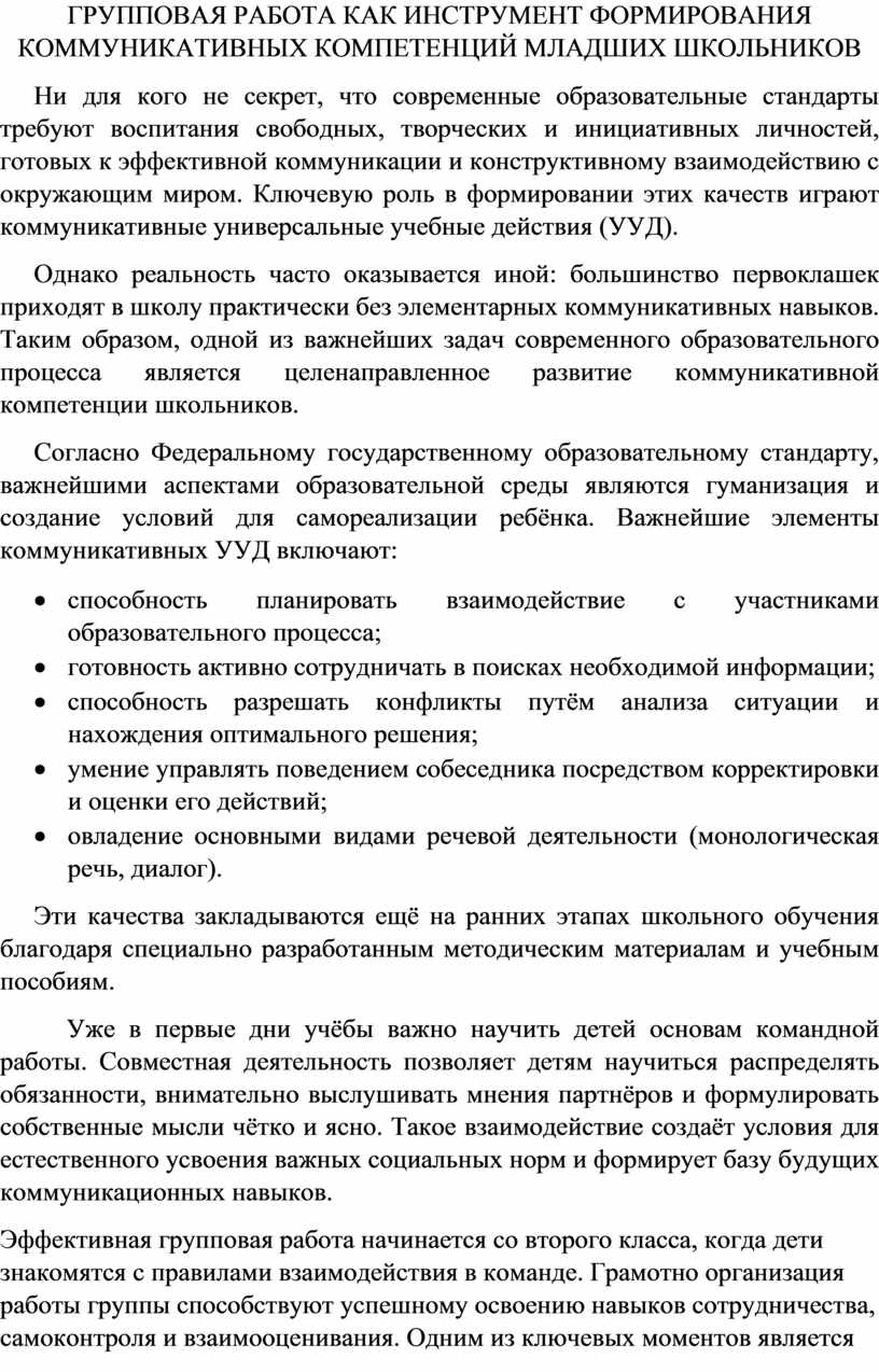 ГРУППОВАЯ РАБОТА КАК ИНСТРУМЕНТ ФОРМИРОВАНИЯ КОММУНИКАТИВНЫХ КОМПЕТЕНЦИЙ МЛАДШИХ ШКОЛЬНИКОВ