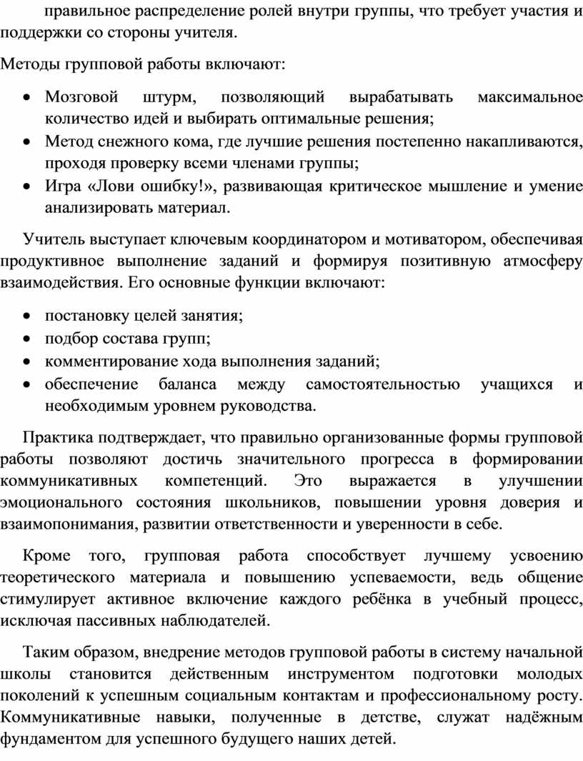 Таким образом, внедрение методов групповой работы в систему начальной школы становится действенным инструментом подготовки молодых поколений к успешным социальным контактам и профессиональному росту. Коммуникативные навыки, полученные в детстве, служат надёжным фундаментом для успешного будущего наших детей.