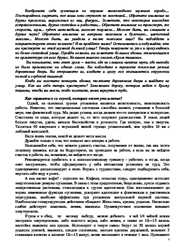 В ГРУППОВОЙ КОНСУЛЬТАЦИИ С ЭЛЕМЕНТАМИ ТРЕНИНГА - «О ЭМОЦИОНАЛЬНЫХ СОСТОЯНИЯХ И ПРОФИЛАКТИКЕ УТОМЛЕНИЯ», говорится о том, что состояние утомления понимается как временное снижение работоспособности под влиянием длительного воздействия на¬грузки. Утомление приводит к распаду выполнения сложных двигательных навыков по типу координированной реализации отдельных моторных стереотипов.В ГРУППОВОЙ КОНСУЛЬТАЦИИ С ЭЛЕМЕНТАМИ ТРЕНИНГА - «О ЭМОЦИОНАЛЬНЫХ СОСТОЯНИЯХ И ПРОФИЛАКТИКЕ УТОМЛЕНИЯ», говорится о том, что состояние утомления понимается как временное снижение работоспособности под влиянием длительного воздействия на¬грузки. Утомление приводит к распаду выполнения сложных двигательных навыков по типу координированной реализации отдельных моторных стереотипов.