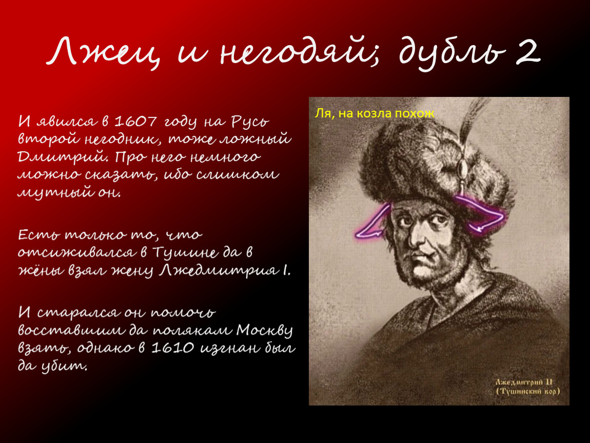И явился в 1607 году на Русь второй негодник, тоже ложный Дмитрий. Про него немного можно сказать, ибо слишком мутный он.
