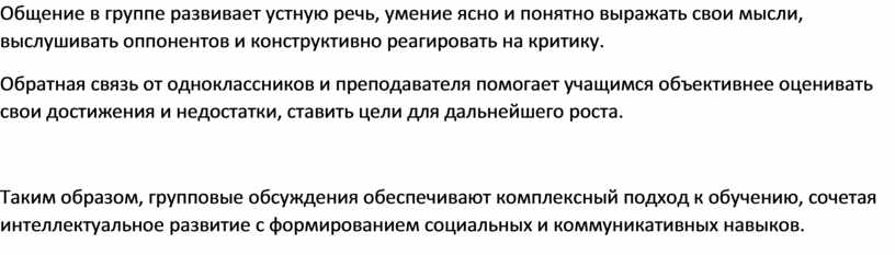 Таким образом, групповые обсуждения обеспечивают комплексный подход к обучению, сочетая интеллектуальное развитие с формированием социальных и коммуникативных навыков.
