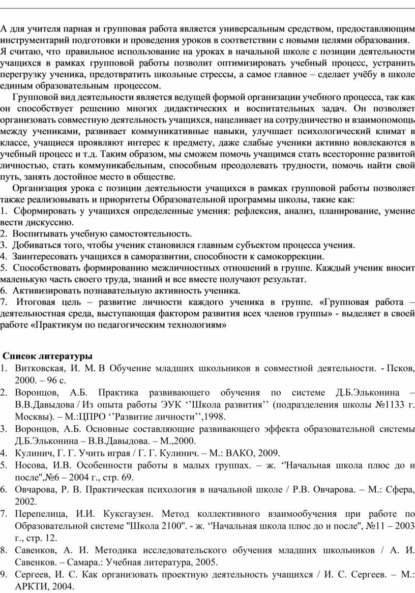 1. Витковская, И. М. В Обучение младших школьников в совместной деятельности. - Псков, 2000. – 96 с.